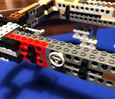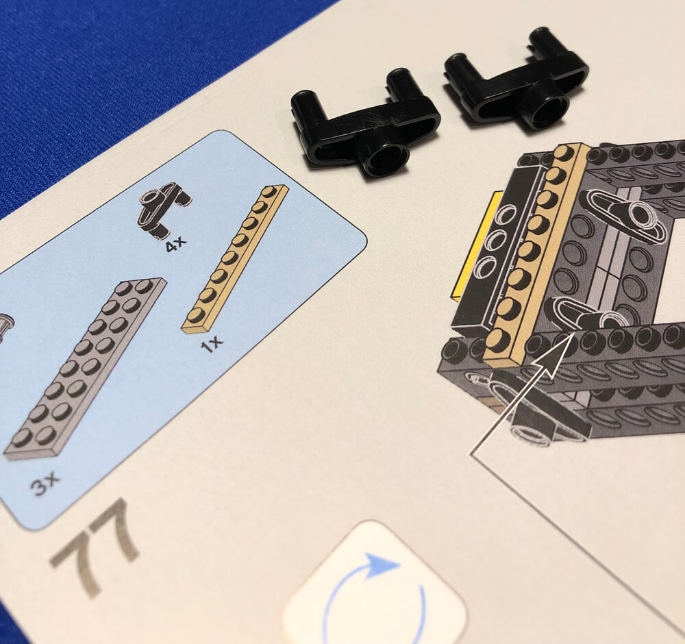 Around Step 77 I discovered the hardest pieces to install: a Technic pin connector 3L with 2 pins and center